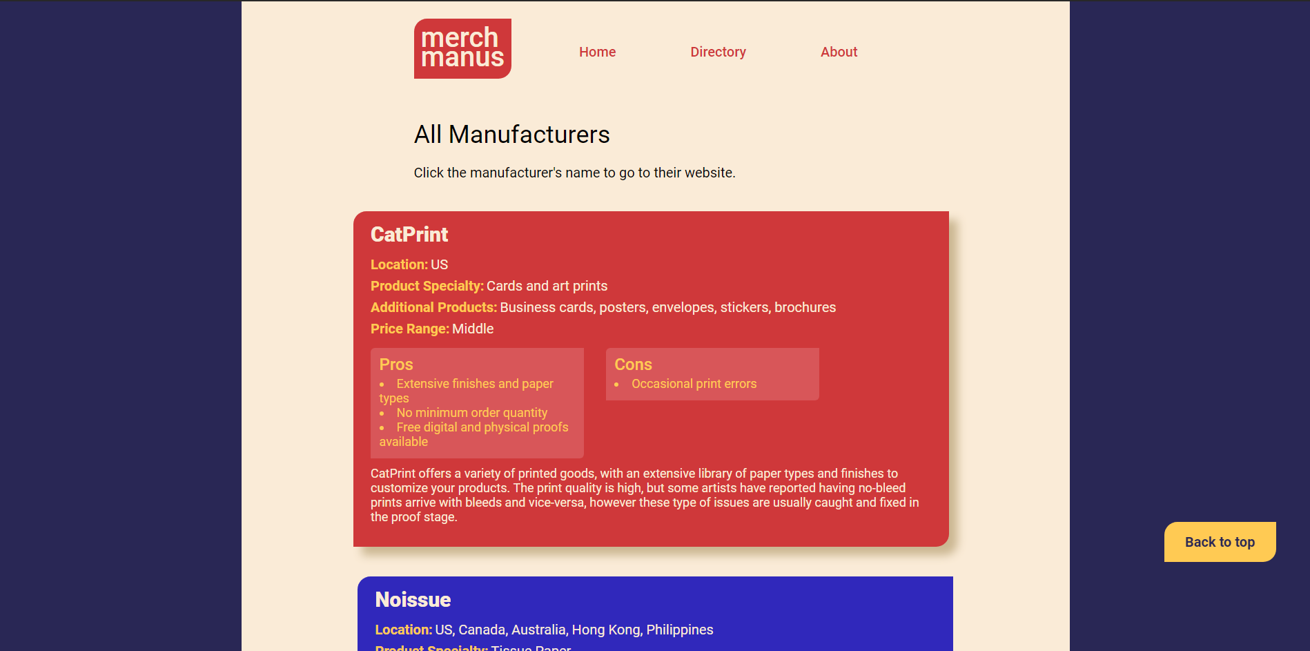 The goal for this project was to create a simple site that serves as a directory of resources and manufacturers for freelance artists who seek to print and sell their work. The site’s main objective is to inform people about what resources are available, and lists price range, pros, and cons for each manufacturer so readers can make an informed decision about where to get their stuff made.